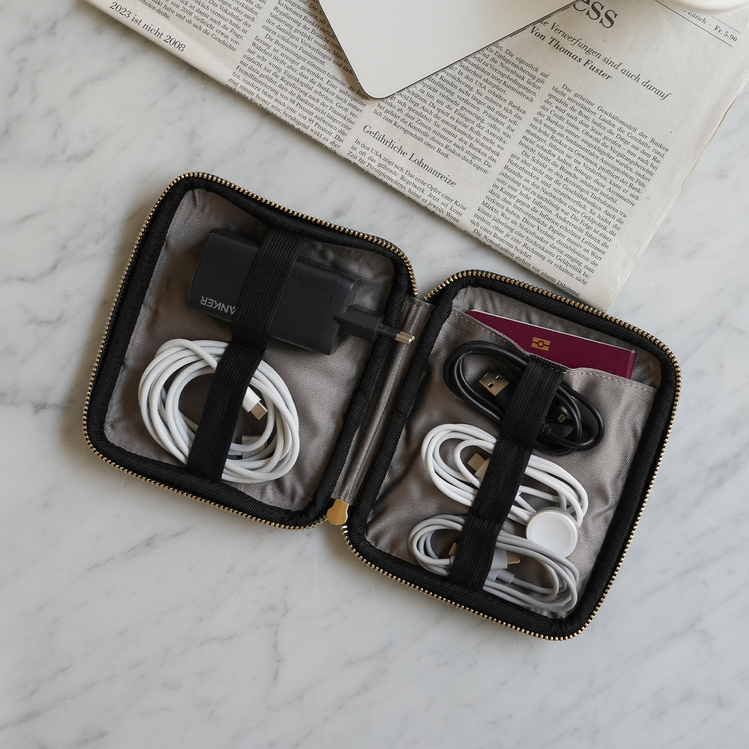 - Vier flache Innenfächer (je 14 cm breit) für Handy oder Alltags-Essentials
